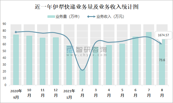 2021年8月伊犁快遞業(yè)務(wù)量與業(yè)務(wù)收入分別為73.6萬件和1674.57萬元