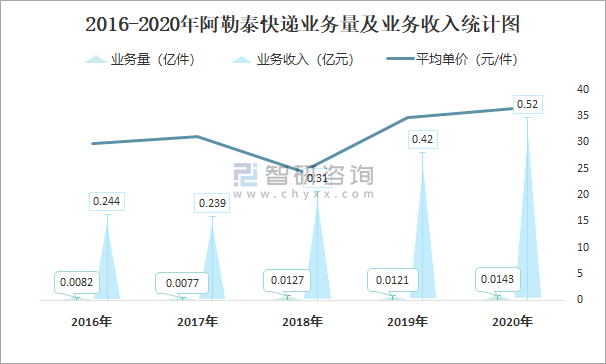 2016-2020年阿勒泰快遞業務量及業務收入統計圖