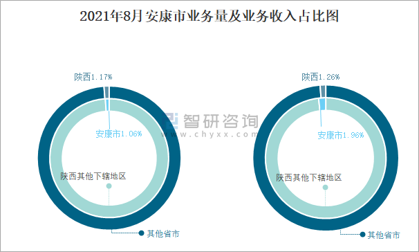根據(jù)各省市郵政局?jǐn)?shù)據(jù)可知:2021年8月安康市快遞業(yè)務(wù)量占陜西快遞業(yè)務(wù)量的1.06%,陜西快遞業(yè)務(wù)量占全國(guó)快遞業(yè)務(wù)量的1.17%;2021年8月安康市快遞業(yè)務(wù)收入占陜西快遞業(yè)務(wù)收入的1.96%,陜西快遞業(yè)務(wù)收入占全國(guó)快遞業(yè)務(wù)收入的1.26%。