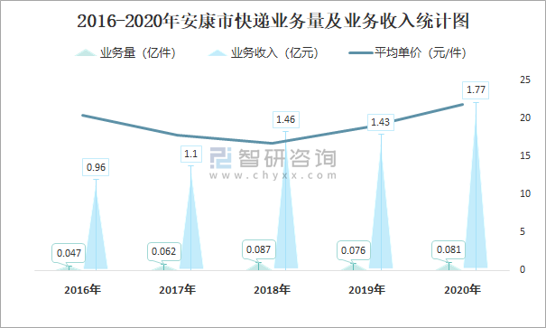 根據(jù)各省市郵政局?jǐn)?shù)據(jù)可知:2021年8月安康市快遞業(yè)務(wù)量為108.47萬(wàn)件,業(yè)務(wù)收入為2025.36萬(wàn)元;2021年1-8月安康市快遞累計(jì)業(yè)務(wù)量為799.47萬(wàn)件,同比增長(zhǎng)75.25%,累計(jì)業(yè)務(wù)收入為15704.51萬(wàn)元,同比增長(zhǎng)58.45%;2016-2020年安康市快遞業(yè)務(wù)量在2018年達(dá)到最大值,此后總體呈現(xiàn)下降趨勢(shì),業(yè)務(wù)收入總體呈現(xiàn)上升趨勢(shì),平均單價(jià)2018年跌至最低值,此后逐年遞增。