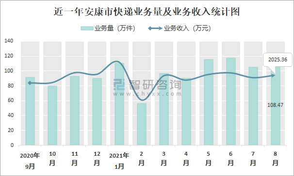 近一年安康市快遞業(yè)務(wù)量及業(yè)務(wù)收入統(tǒng)計(jì)圖