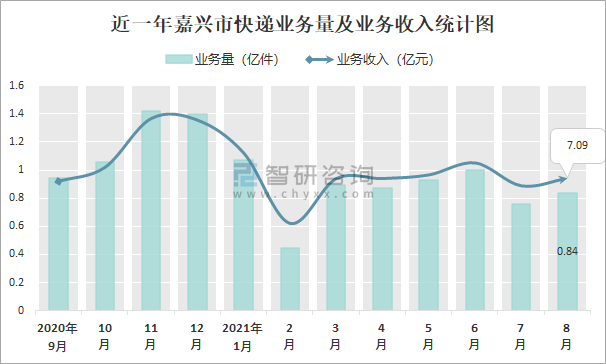 2021年8月嘉興市快遞業(yè)務(wù)量與業(yè)務(wù)收入分別為8408.8萬件和70861萬元