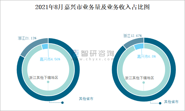 2021年8月嘉興市業(yè)務(wù)量及業(yè)務(wù)收入占比圖