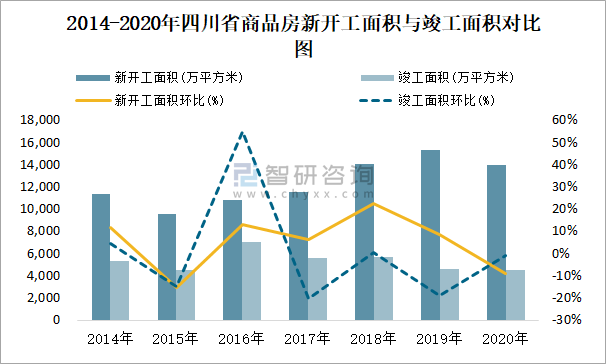 2014-2020年四川省商品房新開工面積與竣工面積對(duì)比圖