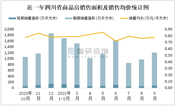 根據(jù)國家統(tǒng)計(jì)局?jǐn)?shù)據(jù)統(tǒng)計(jì)可知:2021年9月四川省商品房銷售面積為1204.02萬平方米(其中銷售現(xiàn)房77.33萬平方米,期房1126.69萬平方米),銷售額為935.52億元,銷售均價(jià)約為0.78萬元/平方米;2021年1-9月四川省商品房累計(jì)銷售面積為10048.08萬平方米,銷售面積累計(jì)同比增長9.6%,累計(jì)銷售額為7882.29億元,銷售額累計(jì)同比增長10.4%;2014-2020年四川省商品房總銷售面積逐年遞增,其中期房銷售面積大大高于現(xiàn)房銷售面積,銷售均價(jià)2015年跌至最低值,此后總體呈現(xiàn)上升趨勢。