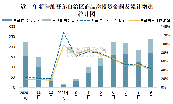 根據國家統計局數據統計可知:2021年9月新疆維吾爾自治區房地產開發投資商品房投資金額為240.25億元(其中商品住宅為170.87億元,辦公樓、商業營業用房等其他用房69.38億元);2021年1-9月新疆維吾爾自治區房地產開發投資商品房累計投資金額為1180.89億元,投資金額累計同比增長40%。