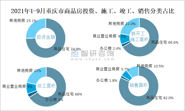 2021年1-9月重慶市商品房投資、施工、竣工、銷售分類占比