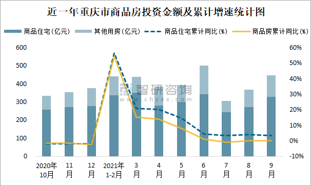 根據國家統計局數據統計可知:2021年9月重慶市房地產開發投資商品房投資金額為447.17億元(其中商品住宅為329.89億元,辦公樓、商業營業用房等其他用房117.28億元);2021年1-9月重慶市房地產開發投資商品房累計投資金額為3291.01億元,投資金額累計同比增長0.2%。