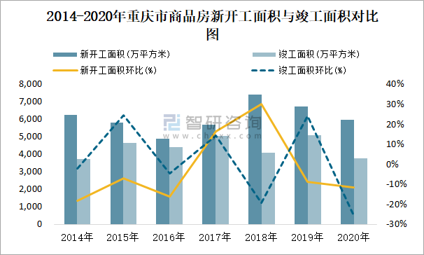 2014-2020年重慶市商品房新開工面積與竣工面積對比圖