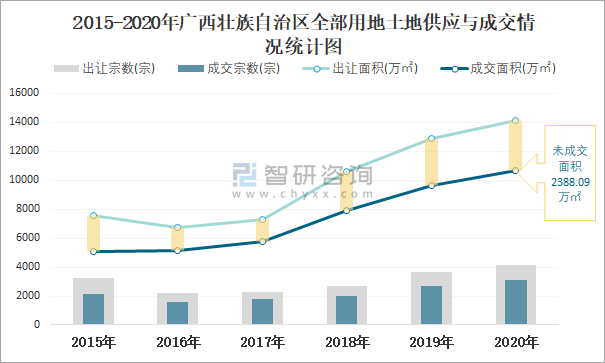 2015-2020年廣西壯族自治區全部用地土地供應與成交情況統計圖