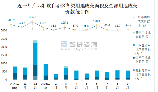 近一年廣西壯族自治區各類用地成交面積及全部用地成交價款統計圖