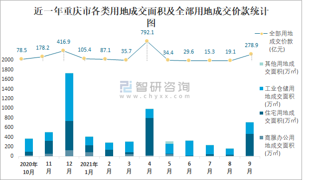 近一年重慶市各類用地成交面積及全部用地成交價款統計圖