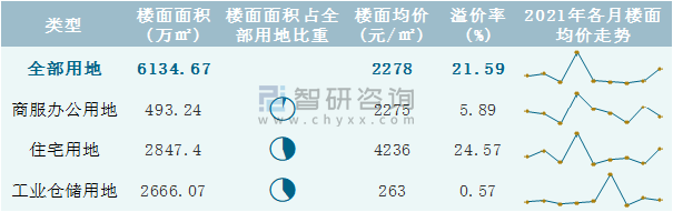 根據國信房地產信息網數據統計可知:2021年9月重慶市全部用地出讓地面均價為5405元/㎡,其中住宅用地出讓地面均價最高(6517元/㎡),全部用地成交地面均價為3948元/㎡,其中住宅用地成交地面均價為5844元/㎡,高于商服辦公用地成交地面均價;2021年1-9月重慶市住宅用地樓面面積占其全部用地比重最多,為46.41%,溢價率為24.57%。