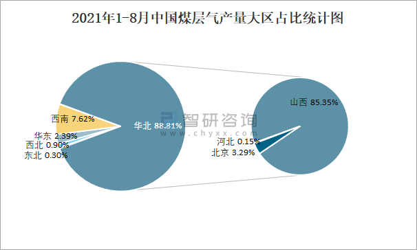 根據國家統計局數據顯示:2021年各季度(第三季度目前暫只統計7月和8月數據)中國煤層氣主要集中在華北、西南、華東地區生產;2021年1-8月中國煤層氣產量大區分布不均衡,其中華北地區產量最高,特別是山西省貢獻了最多產量;2021年1-8月中國煤層氣各省市產量top1遙遙領先于其他省份。