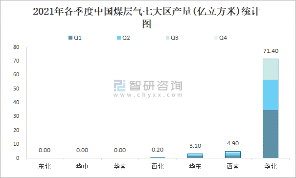 2021年各季度中國煤層氣七大區產量統計圖