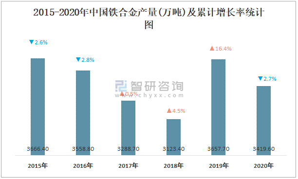 2015-2020年中國鐵合金產量及累計增長率統計圖