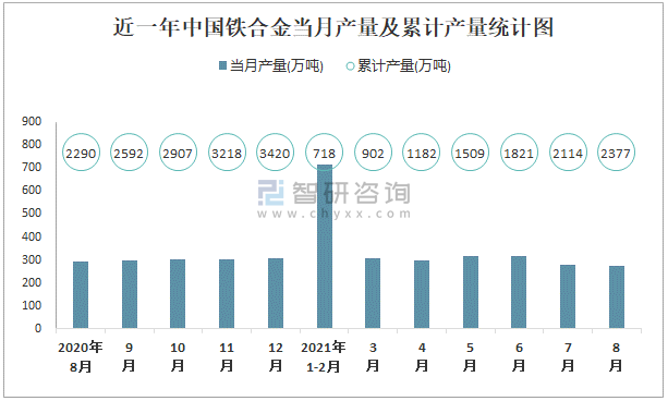 根據國家統計局數據顯示:2021年8月中國鐵合金產量為275萬噸,同比下降13.1%;2021年1-8月中國鐵合金累計產量為2376.6萬噸,累計增長3%;2015-2020年中國鐵合金產量2018年跌至最低,次年大幅度回升。