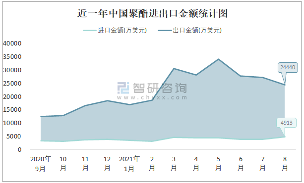 近一年中國聚酯進出口金額統計圖