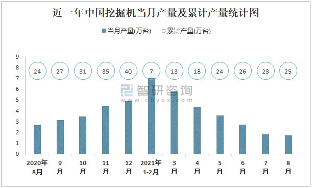 根據國家統計局數據顯示:2021年8月中國挖掘機產量為1.7萬臺,同比下降24.6%;2021年1-8月中國挖掘機累計產量為25萬臺,累計增長17.5%;2015-2020年中國挖掘機產量總體呈現上升趨勢,2020年達到最高。