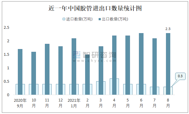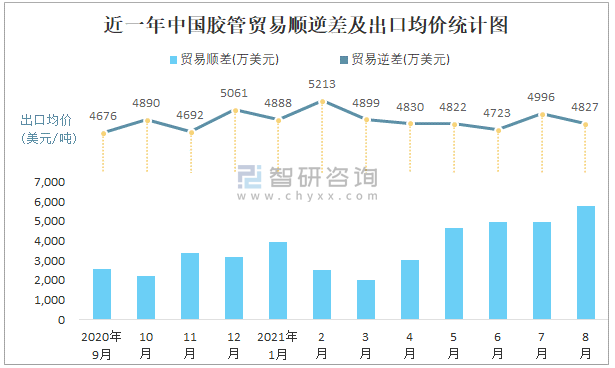 根據中國石油和化學工業聯合會數據顯示:2021年8月中國膠管進口數量為0.3萬噸,出口數量為2.3萬噸;進口金額為5337萬美元,出口金額為11103萬美元;近一年中國膠管出口總金額大于進口總金額,貿易順差為主,8月出口均價4827美元/噸。