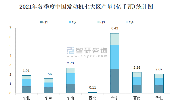 2021年各季度中國(guó)發(fā)動(dòng)機(jī)七大區(qū)產(chǎn)量統(tǒng)計(jì)圖
