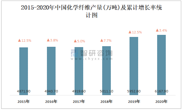 2015-2020年中國化學纖維產量及累計增長率統計圖