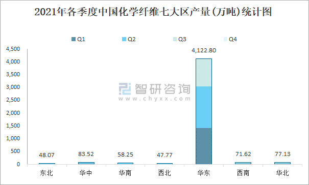 2021年各季度中國化學纖維七大區產量統計圖
