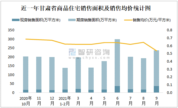 根據國家統計局數據可知:2021年9月甘肅省商品住宅銷售面積為237.72萬平方米(其中銷售現房37.63萬平方米,期房200.09萬平方米),銷售額為127.22億元,銷售均價約為0.54萬元/平方米;2021年1-9月甘肅省商品住宅累計銷售面積為1581.57萬平方米,銷售面積累計同比增長25.6%,累計銷售額為974.02億元,銷售額累計同比增長22.4%;近一年甘肅省商品住宅銷售均價2020年10月達到最高值,此后有所下滑,期房銷售面積遠高于現房銷售面積。