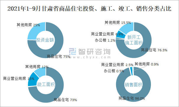 2021年1-9月甘肅省商品住宅投資、施工、竣工、銷售分類占比