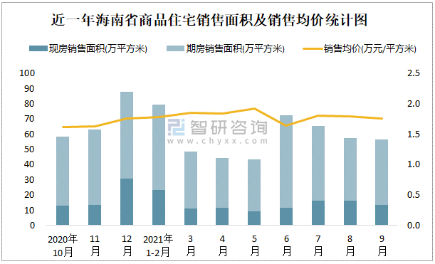 根據(jù)國(guó)家統(tǒng)計(jì)局?jǐn)?shù)據(jù)可知:2021年9月海南省商品住宅銷(xiāo)售面積為56.68萬(wàn)平方米(其中銷(xiāo)售現(xiàn)房13.29萬(wàn)平方米,期房43.39萬(wàn)平方米),銷(xiāo)售額為99.5億元,銷(xiāo)售均價(jià)約為1.76萬(wàn)元/平方米;2021年1-9月海南省商品住宅累計(jì)銷(xiāo)售面積為466.9萬(wàn)平方米,銷(xiāo)售面積累計(jì)同比增長(zhǎng)11.9%,累計(jì)銷(xiāo)售額為833.96億元,銷(xiāo)售額累計(jì)同比增長(zhǎng)19.3%;近一年海南省商品住宅銷(xiāo)售均價(jià)2021年5月達(dá)到最高值,此后有所下滑,期房銷(xiāo)售面積遠(yuǎn)高于現(xiàn)房銷(xiāo)售面積。