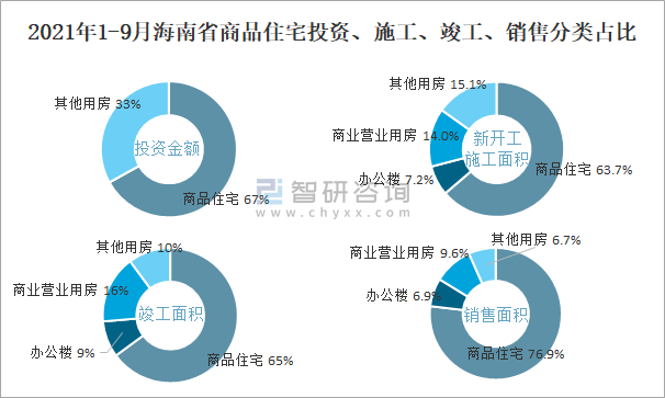 2021年1-9月海南省商品住宅投資、施工、竣工、銷(xiāo)售分類(lèi)占比