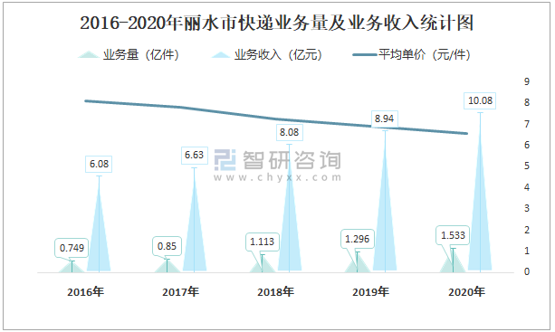 2016-2020年麗水市快遞業務量及業務收入統計圖