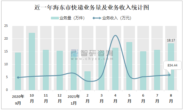 近一年海東市快遞業(yè)務(wù)量及業(yè)務(wù)收入統(tǒng)計圖