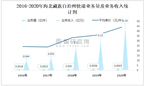 2016-2020年海北藏族自治州快遞業務量及業務收入統計圖