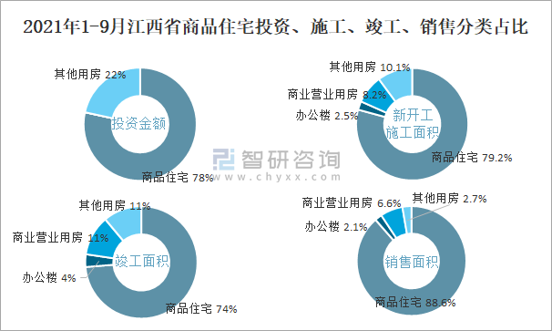 2021年1-9月江西省商品住宅投資、施工、竣工、銷售分類占比