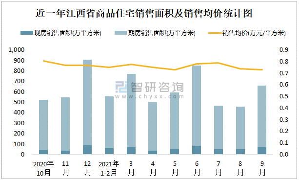 根據(jù)國家統(tǒng)計(jì)局?jǐn)?shù)據(jù)可知:2021年9月江西省商品住宅銷售面積為660.27萬平方米(其中銷售現(xiàn)房70.37萬平方米,期房589.9萬平方米),銷售額為480.85億元,銷售均價(jià)約為0.73萬元/平方米;2021年1-9月江西省商品住宅累計(jì)銷售面積為4851.05萬平方米,銷售面積累計(jì)同比增長25%,累計(jì)銷售額為3671.03億元,銷售額累計(jì)同比增長26.9%;近一年江西省商品住宅銷售均價(jià)2020年10月達(dá)到最高值,此后有所下滑,期房銷售面積遠(yuǎn)高于現(xiàn)房銷售面積。