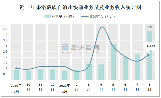 2021年8月果洛藏族自治州快遞業(yè)務(wù)量與業(yè)務(wù)收入分別為4.34萬件和113.95萬元