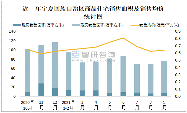 根據國家統計局數據可知:2021年9月寧夏回族自治區商品住宅銷售面積為77.2萬平方米(其中銷售現房7.39萬平方米,期房69.81萬平方米),銷售額為49.51億元,銷售均價約為0.64萬元/平方米;2021年1-9月寧夏回族自治區商品住宅累計銷售面積為628.34萬平方米,銷售面積累計同比下降2.5%,累計銷售額為433.92億元,銷售額累計同比增長2.6%;近一年寧夏回族自治區商品住宅銷售均價2020年11月跌至最低值,此后總體呈現上升趨勢,期房銷售面積遠高于現房銷售面積。