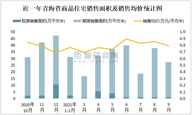 根據國家統計局數據可知:2021年9月青海省商品住宅銷售面積為27.34萬平方米(其中銷售現房0.96萬平方米,期房26.38萬平方米),銷售額為21.69億元,銷售均價約為0.79萬元/平方米;2021年1-9月青海省商品住宅累計銷售面積為240.61萬平方米,銷售面積累計同比下降19.9%,累計銷售額為192.63億元,銷售額累計同比下降23.5%;近一年青海省商品住宅銷售均價2021年6月達到最高值,此后有所下滑,期房銷售面積遠高于現房銷售面積。