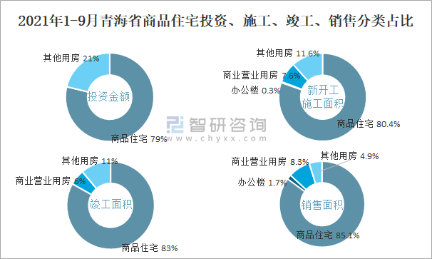 2021年1-9月青海省商品住宅投資、施工、竣工、銷售分類占比