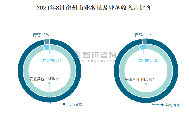 根據各省市郵政局數據可知:2021年8月宿州市快遞業務量占安徽快遞業務量的3.7%,安徽快遞業務量占全國快遞業務量的2.98%;2021年8月宿州市快遞業務收入占安徽快遞業務收入的4.1%,安徽快遞業務收入占全國快遞業務收入的2.14%。