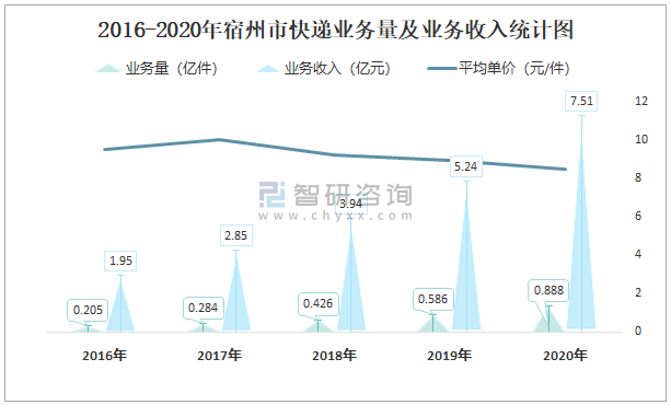 2016-2020年宿州市快遞業務量及業務收入統計圖