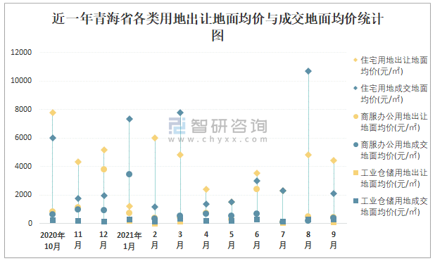根據國信房地產信息網數據統計可知:2021年9月青海省全部用地出讓地面均價為697元/㎡,其中住宅用地出讓地面均價最高(4422元/㎡),全部用地成交地面均價為694元/㎡,其中住宅用地成交地面均價為2095元/㎡,高于商服辦公用地成交地面均價;2021年1-9月青海省住宅用地樓面面積占其全部用地比重最多,為57.34%,溢價率為7.85%。