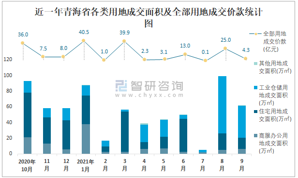 近一年青海省各類用地成交面積及全部用地成交價款統計圖