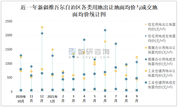 近一年新疆維吾爾自治區各類用地出讓地面均價與成交地面均價統計圖