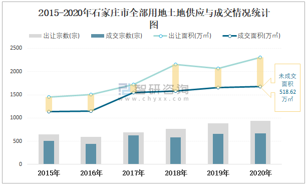 2015-2020年石家莊市全部用地土地供應與成交情況統計圖