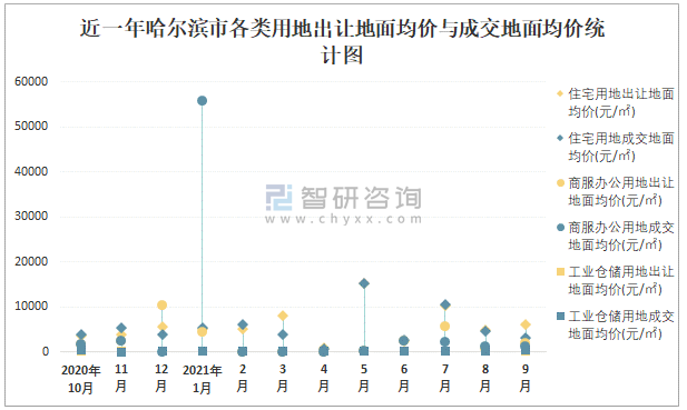 近一年哈爾濱市各類用地出讓地面均價(jià)與成交地面均價(jià)統(tǒng)計(jì)圖