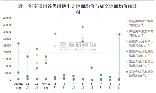近一年南京市各類(lèi)用地出讓地面均價(jià)與成交地面均價(jià)統(tǒng)計(jì)圖