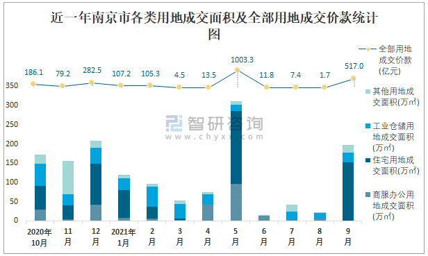近一年南京市各類(lèi)用地成交面積及全部用地成交價(jià)款統(tǒng)計(jì)圖