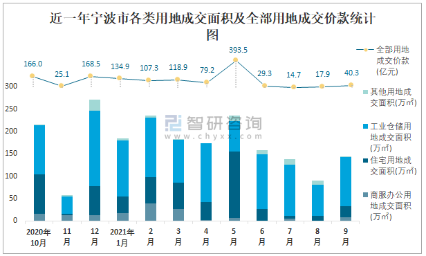 近一年寧波市各類用地成交面積及全部用地成交價(jià)款統(tǒng)計(jì)圖